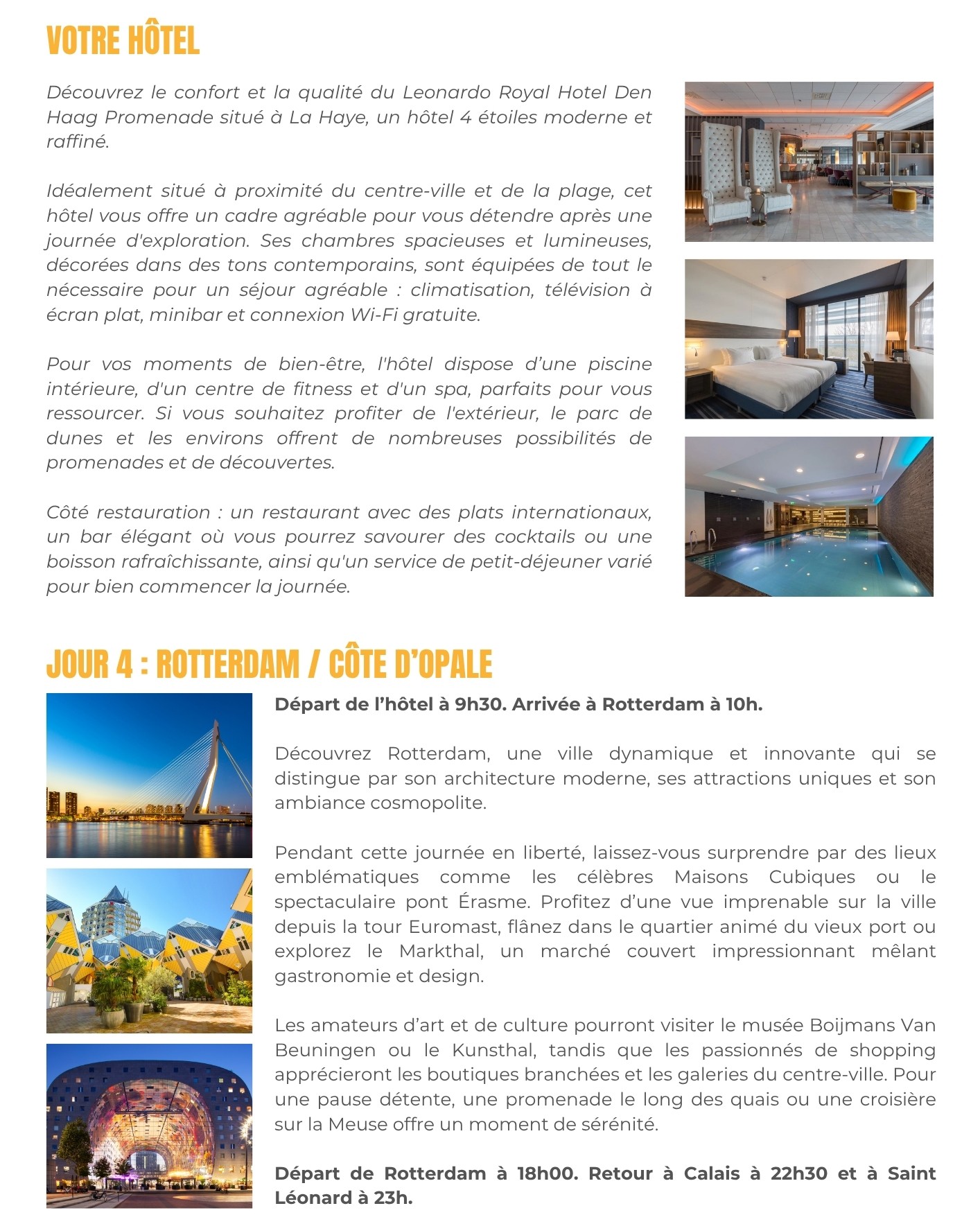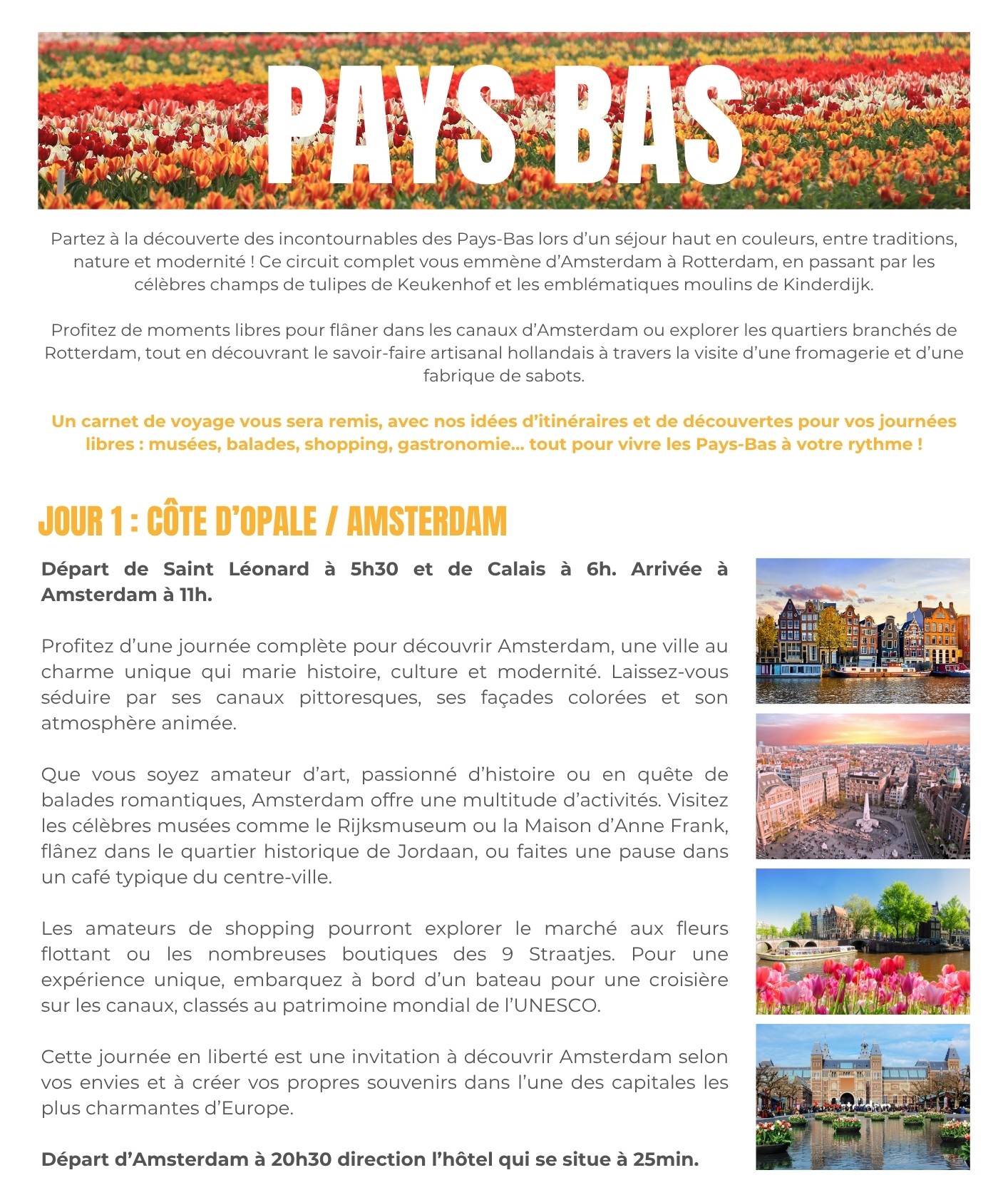 Départ de Saint Léonard : 5h30 - Départ de Calais : 6h00 - Arrivée à Amsterdam à 11h.